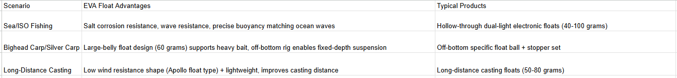 Az EVA halászat úszik az anyagi teljesítmény-innováció (nem abszorbens, nagy rugalmasság) és a funkcionális tervezési bővítés (alsó fúrókészülékek, elektronikus integráció) révén, a forgatókönyvek teljes skáláját fedi le az édesvízi bighead ponty halászattól a mélytengeri ISO horgászásig. Jelentős előnyöket mutatnak, különösen a nagy intenzitású és összetett környezetben.